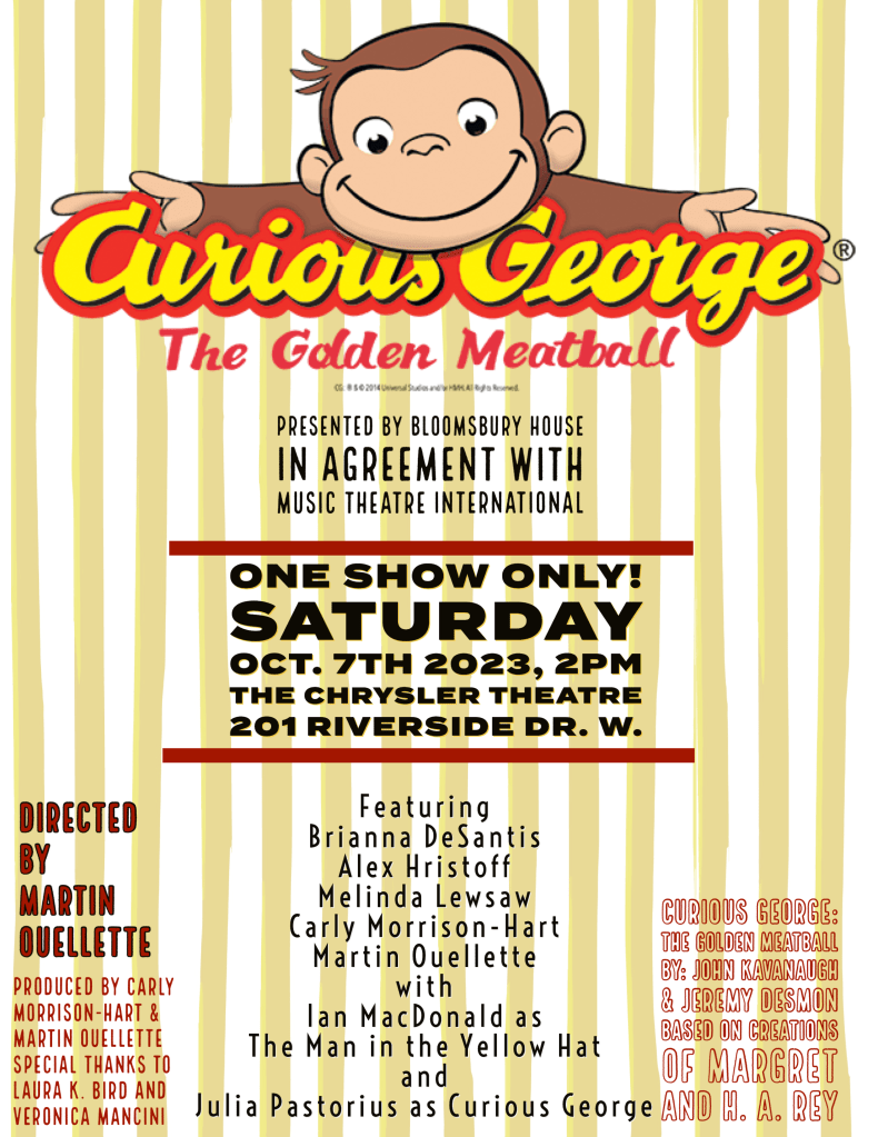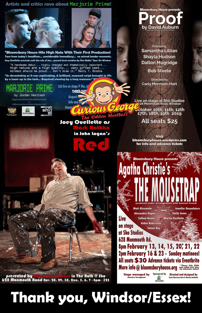 A graduate of UWindsor’s arts faculty with an Artist in Community Education I/S B.Ed. from Queen’s University, Martin’s local directing credits include Red, The Mousetrap, and Marjorie Prime (Bloomsbury House, co-direct with Carly Morrison-Hart), Evil Dead: The Musical, Not Another High School Murder!, and Pirates of Penzance (Extension-Korda), Fiddler on the Roof (co-direct w/Cardinal Music Productions), Macbeth (Korda Artistic Productions, co-direct w/Sean Westlake), and Curious George: The Golden Meatball (Bloomsbury House @ the Chrysler Theater).